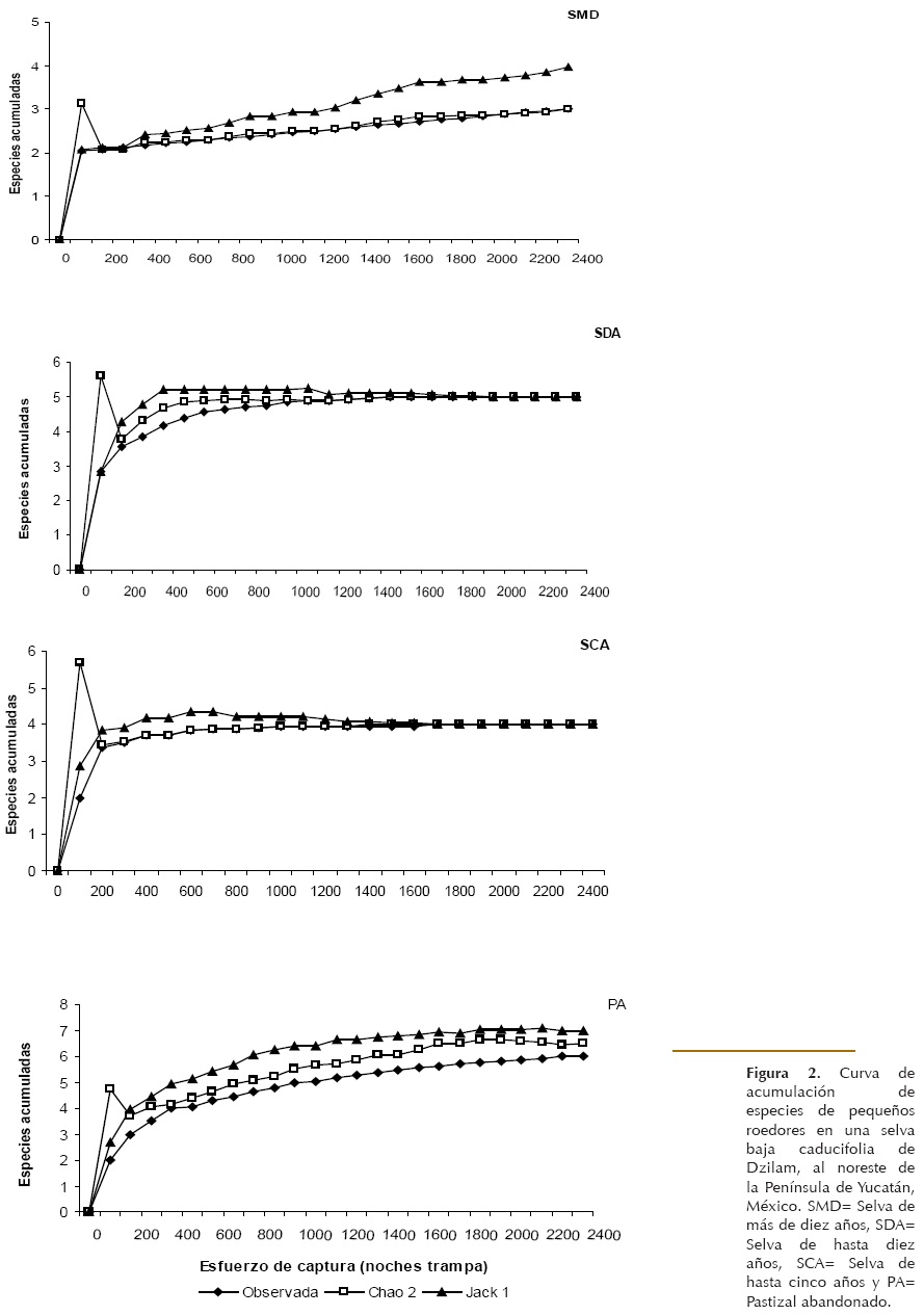 Diversidad de pequeños roedores.- Se capturaron 478 individuos con 1,754 capturas, en 9,600 noches trampa. Estos correspondieron a seis especies de las familias Cricetidae y Heteromyidae (Tabla 2). El sitio que aportó el mayor número de individuos fue SMD con el 38% (40% recapturas), seguido de SDA con el 24% (20% recapturas), SCA con el 22% (24% recapturas) y PA con el 16% (16% recapturas). Ototylomys phyllotis fue la especie más abundante (47% de las capturas), seguida por Peromyscus yucatanicus (41%). Otras cuatro especies se consideraron especies raras, por presentar capturas menores al 10% del total: Heteromys gaumeri, Reithrodontomys gracilis, Mus musculus y Sigmodon hispidus.