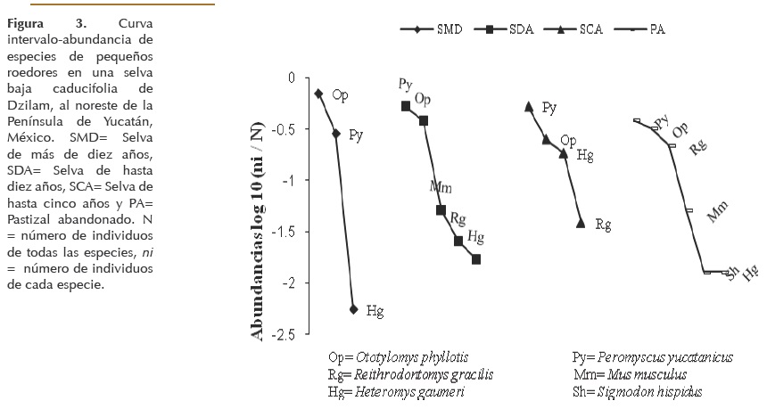 En cuanto a las gráficas de abundancia - diversidad, se observan diferencias entre las pendientes de la selva de más de diez años y el pastizal (Fig. 3). En la primera hay una mayor abundancia total, menor riqueza de especies y mayor dominancia, mientras que en PA hay una menor abundancia total, una mayor riqueza específica y una menor dominancia. Las selvas de SDA y SCA ocupan una posición intermedia entre estos dos extremos. P. yucatanicus y O. phyllotis se presentaron en la misma posición jerárquica en SDA, SCA y PA como primera y segunda especies más abundantes, respectivamente. La rata arborícola O. phyllotis fue la más abundante en SMD. Entre las especies raras únicamente S. hispidus se presentó en PA, las otras fueron compartidas en dos o tres sitios.