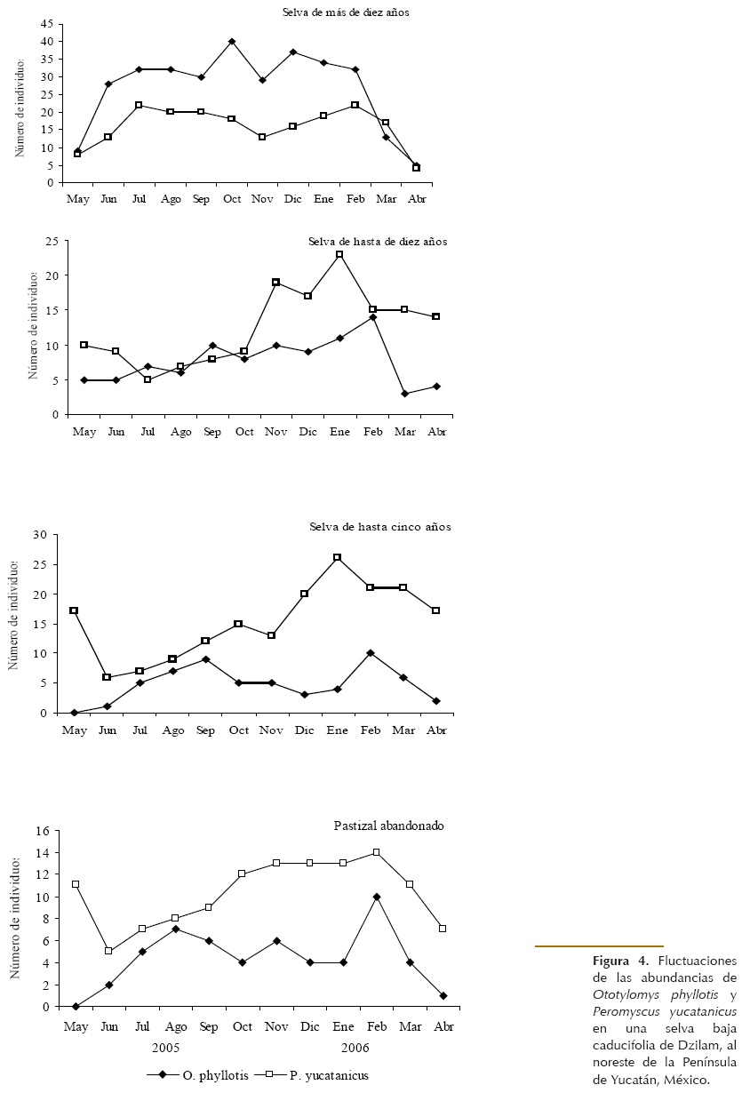 Relación entre la abundancia de roedores y los atributos de la vegetación.- La abundancia de M. musculus se relaciona inversamente con el porcentaje de cobertura de especies herbáceas (rs = -0.95, P < 0.05). De manera similar la abundancia de R. gracilis se relaciona inversamente con a la altura (rs = -1.0, P < 0.01) y al número de especies arbóreas (rs = -0.95, P < 0.05). En contraste, la abundancia de O. phyllotis se relaciona directamente con la altura de los árboles (rs = 1.0, P < 0.01), y al número de especies arbóreas (rs = 0.95, P < 0.05). No se encontró ninguna relación en la abundancia de P. yucatanicus con los atributos de la vegetación (P > 0.05). Las abundancias de O. phyllotis fueron mayores en los sitios de mayor regeneración vegetal (SMD, SDA) que en los que la tuvieron menos (SCA, PA). Las máximas abundancias fueron en los meses de octubre en SMD y de enero-febrero en SDA, SCA y PA, aunque en los dos últimos sitios se observó otro máximo en septiembre-octubre de 2006. P. yucatanicus fue la especie más abundante en los sitios SDA, SCA y PA, presentando un máximo en la época seca (enero-febrero, Fig. 4).