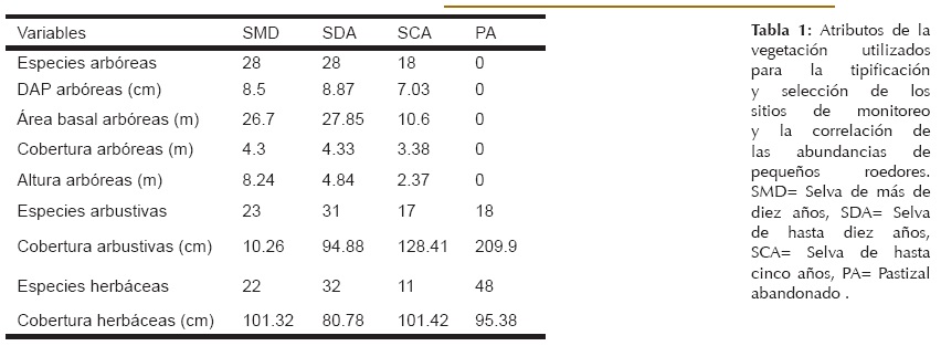 Relación entre la abundancia de roedores y los atributos de la vegetación.- En este estudio se observó un claro efecto del grado de perturbación sobre la abundancia de las especies de roedores quizá debido a características de la vegetación y el manejo antropogénico realizado en cada sitio. Factores como el aislamiento de los fragmentos, tamaño, calidad y diversidad del parche, así como la cobertura vegetal, pueden determinar en gran medida la abundancia de las especies presentes en un sitio particular (Bolger et al. 1997, Arroyo-Rodríguez y Mandujano 2009).