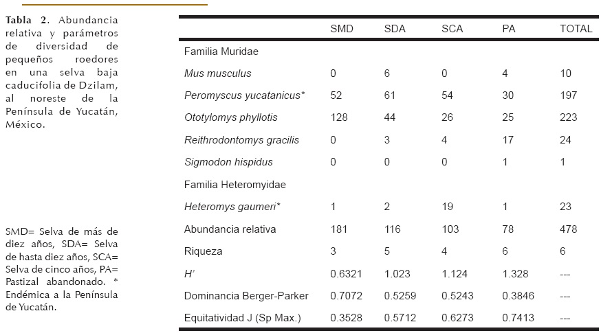 Riqueza y diversidad.- El número de especies observadas representa el 75% de las registradas para la Reserva Estatal de Dzilam (Hernández-Betancourt et al. 1996) y el 50% de las descritas para el estado de Yucatán (Jones et al. 1974). La riqueza y diversidad de roedores (3-6 especies) fueron diferentes entre los sitios estudiados, presentándose una mayor diversidad en el sitio más perturbado (PA) con respecto al menos perturbado (SMD). Esto se atribuye probablemente a que es un área pequeña (8 ha) rodeada por selva baja caducifolia espinosa en sucesión, lo que permitió capturar especies de hábitos arborícolas como O. phyllotis y la captura ocasional de H. gaumeri, así como a la presencia de M. musculus y S. hispidus que parecen preferir ambientes distintos a la selva.