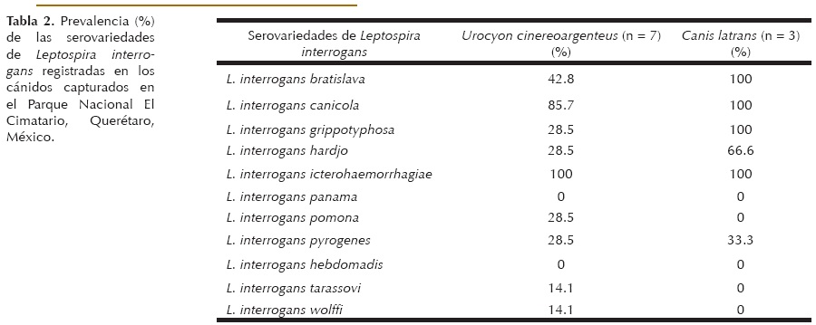 Tres coyotes fueron positivos a siete de las once serovariedades analizadas (63.6% prevalencia), mientras que las zorras grises registraron ocho de las once serovariedades (72.7%),. En ambos casos, todas las serovariedades fueron consideradas como típicas de animales domésticos, siendo Leptospira interrogans canicola, la serovariedad que presentó los títulos más altos, desde 1:1600 a 1:6400, con una prevalencia de 85.7% en las zorras grises y del 100% en coyotes (Tabla 2).
