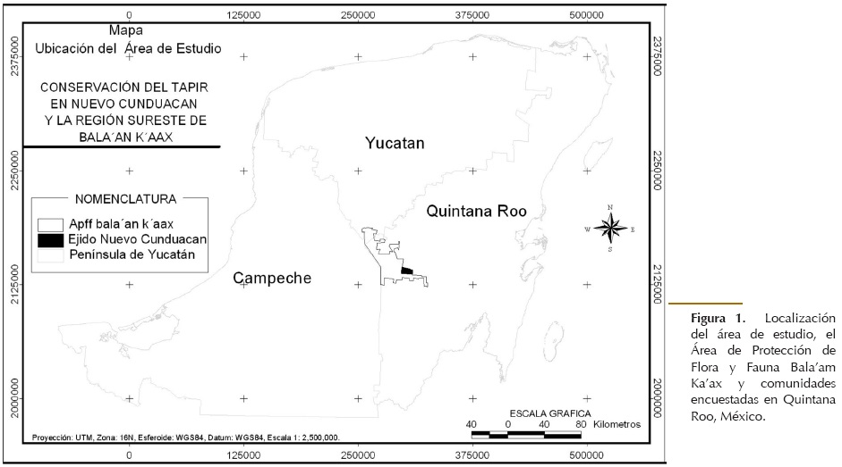 El área de estudio, el APFFBK se ubica al oeste del estado de Quintana Roo; su ubicación (19° 24' 53'' N y 88° 81' 60'' O) es estratégica para la conservación debido a la conectividad con la Reserva de la Biosfera Calakmul y el Área Natural Protegida de Balam-Ku, ambas en Campeche. El área de estudio se ubica en el municipio de José María Morelos, Quintana Roo, el cual limita al sureste con los ejidos Nuevo Cunduacán, Plan de Noria, Venustiano Carranza y San Isidro (Fig. 1). La elevación de los suelos varía entre 100 a 400 msnm; la temperatura media anual es de 24.6° C y predomina el clima cálido subhúmedo con lluvias en verano (AW1) con una precipitación anual de 1400 mm (García 1988). La vegetación predominante es selva mediana subcaducifolia y selva baja subperennifolia (Rzedowski 1978).