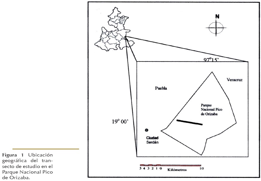 El estudio se realizó en el Parque Nacional Pico de Orizaba, el cual comprende un área total de 19,756 ha, se encuentra ubicado en el Estado de Puebla, en los Municipios de Tlachichuca, Chalchicomula de Sesma, Atzitzintla; y en Veracruz (Chalcahualco y La Perla). Se localiza entre 18° 56' 30'' y 19° 09' 30'' Latitud N, y entre 97° 12' 30'' y 97° 22' 30'' Longitud W (Vargas 1984). Presenta un intervalo altitudinal que va de los 2,700 a los 5,760 m, y queda a unos 200 km al este de la Ciudad de México, en el borde de la Meseta Central (Lorenzo 1964, Fig. 1).