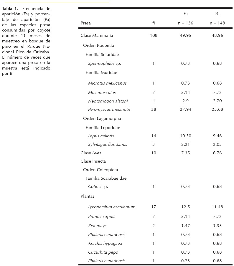 La dieta del coyote en bosque de pino en el área de estudio estuvo constituida por 15 especies-presas, aunque no fue posible determinar hasta nivel específico todos los restos encontrados en los excrementos.