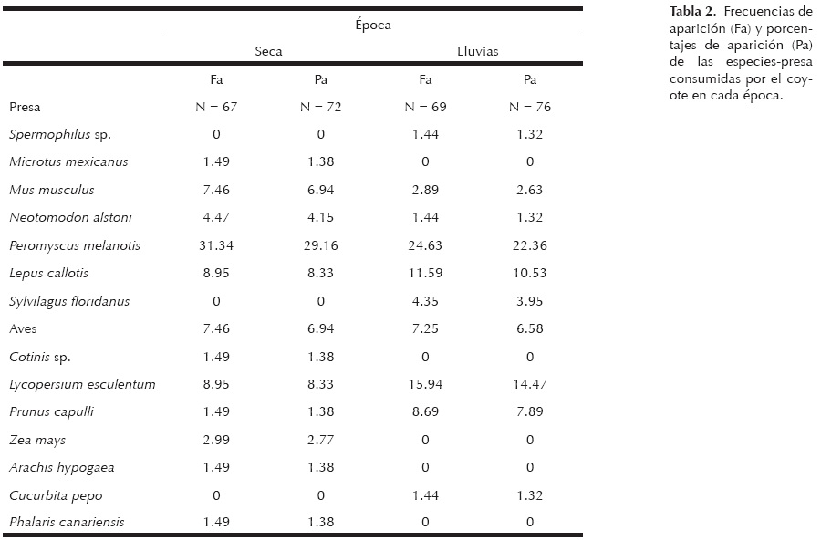 Al comparar el porcentaje de aparición para cada uno de los componentes por temporada, se observa que en la época seca la especie con el porcentaje de aparición más alto fue P. melanotis (29.16%), seguida por la liebre (Lepus callotis) y los frutos de tomate Lycopersicum esculentum (8.33% para cada alimento), después las aves y el ratón Mus musculus (6.94% para cada una) y el menor porcentaje fue para el coleóptero (Cotinis sp; 1.38%; tabla 2).