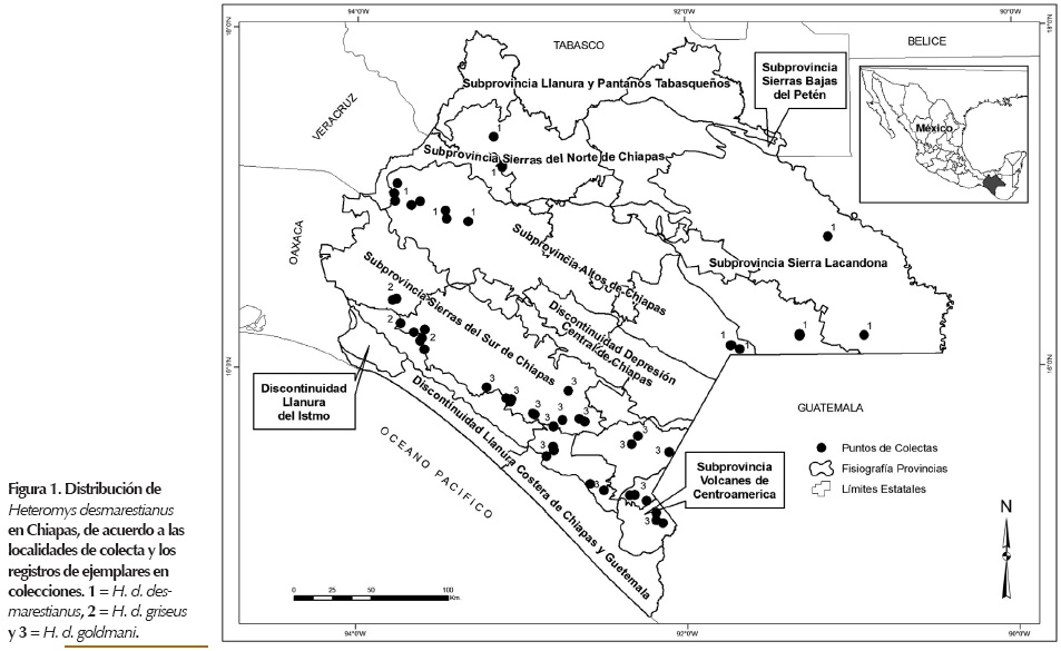 Con base en la diferenciación de las subespecies se considera que la distribución geográfica de las subespecies de Heteromys en Chiapas no es uniforme. H. d. griseus y H. d. goldmani ocurren en la subprovincia Sierras del Sur, la primera se encuentra en la parte noroeste de la subprovincia llegando hasta Oaxaca; al parecer su límite de distribución se encuentra en la parte serrana de Villaflores; en cambio, la segunda se encuentra en la parte sureste de la subprovincia encontrándose en la parte de Volcanes de Centroamérica llegando hasta la parte serrana de Guatemala (Hall 1981). Es necesario llevar a cabo estudios detallados para conocer las condiciones climáticas, ecológicas y las posibles barreras físicas y/o evolutivas que impiden que H. d. griseus y H. d. goldmani presenten una distribución continua a lo largo de la subprovincia Sierras del Sur, aunque es notorio el grado de diferenciación morfométrica que existe entre ambas.