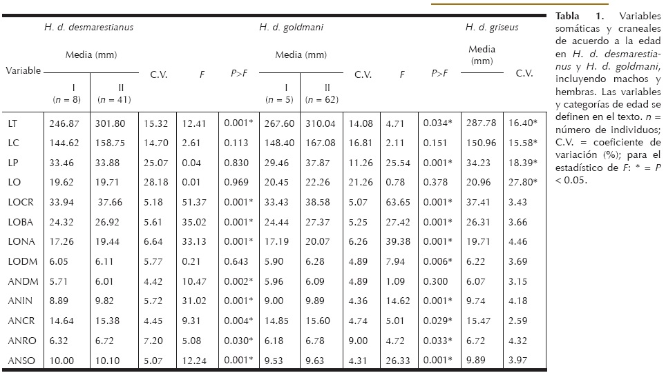 Variación morfométrica debida a la edad. Los resultados del ANOVA para las dos categorías de edad (I = jovenes, II = adultos) mostraron diferencias significativas en donde los adultos presentaron un mayor tamaño (P < 0.05). En H. d. desmarestianus existieron diferencias significativas en tamaños en la variable somática longitud total (LT) y en ocho variables craneales: longitud total del cráneo (LCR), longitud basal de cráneo (LOBA), longitud de los nasales (LONA), anchura de la hilera maxilar de dientes (ANDM), anchura interorbital (ANIN), anchura de la caja craneal (ANCR), anchura del rostro (ANRO), y anchura menor de supraoccipital (ANSO), siendo los adultos más grandes (Tabla 1). En H. d. goldmani hubo diferencias significativas (P < 0.05) en dos variables somáticas: LT y LP y en ocho variables craneales: longitud total del cráneo (LCR), longitud basal de cráneo (LOBA), longitud de los nasales (LONA), longitud de hilera de dientes maxilar (LODM), anchura interorbital (ANIN), anchura de la caja craneal (ANCR), anchura del rostro (ANRO), y anchura menor de supraoccipital (ANSO), siendo los adultos más grandes (Tabla 1). No fue posible realizar la comparación entre las categorías de edad de H. d. griseus debido a que sólo se encontraron individuos adultos.