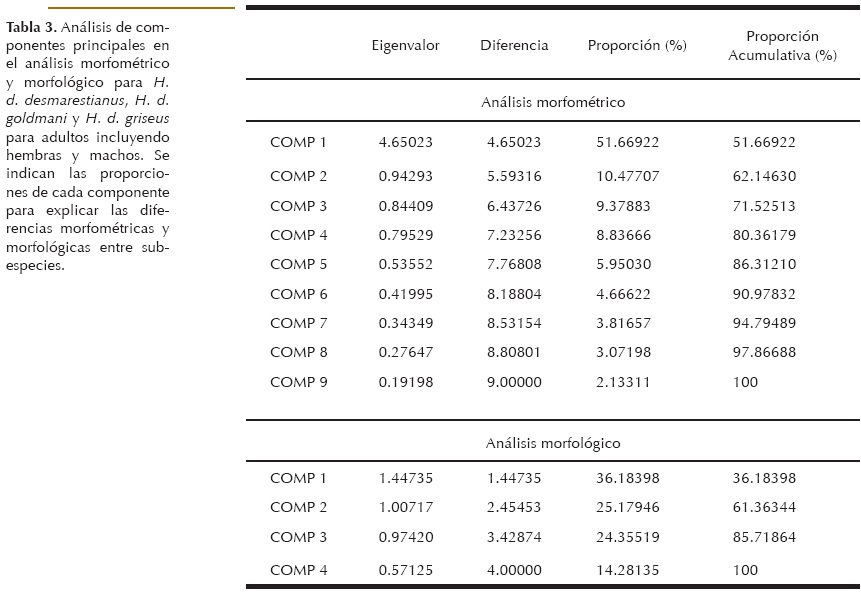El análisis de función discriminante asignó correctamente a H. d. goldmani en un 79.7%, a H. d. desmarestianus en un 48.8% y a H. d. griseus en un 25%. En el fenograma del análisis de cluster se observó que morfológicamente H. d. goldmani se separa del resto de las subespecies y está menos relacionado morfológicamente con H. d. desmarestianus y H. d. griseus; por lo que estas últimas subespecies están morfológicamente más relacionadas entre sí (Fig. 2B).