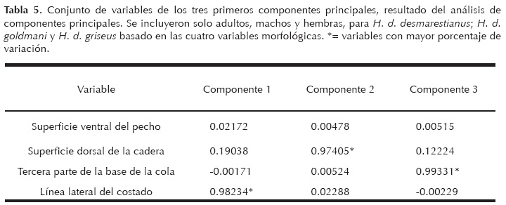 Variación morfométrica debida al sexo. No hubo diferencias estadísticamente significativas del total de variables somáticas y craneales entre machos y hembras de las tres subespecies de H. desmarestianus de acuerdo al análisis de varianza (ANOVA; P > 0.05, Tabla 2). No obstante, se observó que en promedio los machos son de una talla mayor (longitud total) que las hembras, 5.7% más grandes en H. d. desmarestianus, 8.5% en H. d. goldmani, y 5.7% en H. d. griseus.