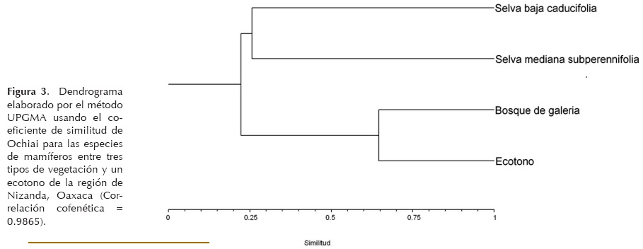 De las 40 especies registradas, sólo Choeroniscus godmani estuvo presente en los tres tipos de vegetación, mientras que 30 (75%) estuvieron restringidas a un sólo tipo. Las selvas baja caducifolia y mediana subcaducifolia mostraron los valores más altos en número de especies (20 y 13, respectivamente) y especies exclusivas (19 y 12, respectivamente), mientras que el ecotono tuvo representadas únicamente seis especies, incluyendo en forma exclusiva al murciélago Artibeus lituratus. La similitud de la composición de la fauna de mamíferos entre tipos de vegetación fue baja, en promedio del 30%, y con excepción del ecotono y el bosque de galería que mostraron similitud del 64.55%. El resto de combinaciones pareadas de tipos de vegetación muestran similitudes menores al 30%, con la selvas baja caducifolia y el bosque de galería como los tipos menos similares (21.21%; Fig. 3). El promedio de similitud observado es considerablemente bajo, si se considera por ejemplo que el Istmo de Tehuantepec y la Laguna Inferior, cerca de la zona de estudio, también en estado de Oaxaca, muestran una similitud del 54% (López et al. 2009), a pesar de ser áreas mayores y que incluyen cada una varios tipos de vegetación.