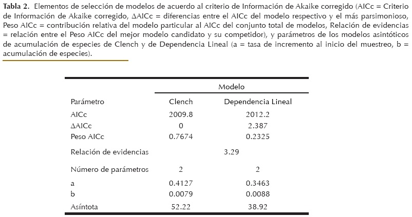 Se obtuvieron un total de 307 registros de mamíferos pertenecientes a 38 especies por los métodos descritos y dos más registradas por Pérez-García et al. (2001). Lo que da un total de 40 especies, distribuidas en 7 ordenes y 17 familias (Tabla 1, Apéndice), que representa el 20.61% de las 194 especies descritas para el estado de Oaxaca (Santos-Moreno et al. 2010a). El modelo de Clench mostró ser el más adecuado, siendo 3.3 veces mejor que el de Dependencia Lineal (Tabla 2, Fig. 2), y de acuerdo con él, el número asintótico de especies esperado es de 52, es decir, que el esfuerzo de colecta realizado aún no es suficiente para tener una representación adecuada de la riqueza de especies de la zona.