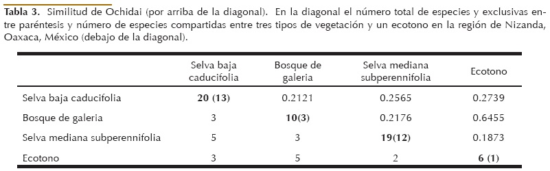 Para conocer la representatividad del esfuerzo de colecta, se construyeron los modelos asintóticos de acumulación de especies de Clench y de Dependencia Lineal (Soberón y Llorente 1993). Con el algoritmo Quasi-Newton, implementado en el programa Statistica (Statsoft 2001). Los datos se aleatorizaron 1,000 veces con el programa EstimatesS versión 8.0.0 (Colwell 2006). El mejor modelo se eligió con el Criterio de Información de Akaike corregido (AICc, Burnham y Anderson 2002; Jiménez-Valverde et al. 2006). La similitud se calculó entre los tres tipos de vegetación principales y el ecotono por medio de un Análisis de Conglomerados, con el método de Análisis de Grupos Pareados sin Ponderar, usando la Media Aritmética (UPGMA por sus siglas en inglés), usando como medida de similitud el coeficiente de Ochiai (Ochiai 1957). Este coeficiente incorpora un centrado que reduce el efecto de la riqueza de especies en la evaluación de la similitud en la composición (Rodríguez y Lewis 1990). Debido a que es menos afectado por el tamaño muestral que otros índices para datos de presencia-ausencia más populares como el de Jaccard (Jackson et al. 1989). Como una medida de evaluación del grado de distorsión de la información contenida en la matriz de presencia-ausencia al ser representada en el dendograma, se empleó el Coeficiente de Correlación Cofenética (Rohlf y Sokal 1981).