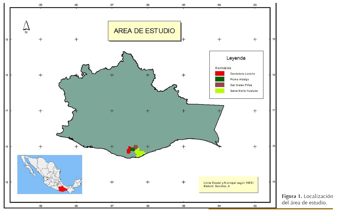 El trabajo de campo se realizó en dos periodos de muestreo, del 21 de junio al 1 de julio de 2008 y del 9 al 11 de diciembre de 2010, en ocho puntos de muestreo, con dos días de muestreo por sitio en fincas cafetaleras asociadas con selva mediana subperennifolia, selva baja caducifolia y bosque de encino (INEGI-INE 1996). Se instalaron cuatro sitios en el municipio de Candelaria Loxicha, dos sitios en Santa María Huatulco, un sitio en el municipio de Pluma Hidalgo y otro sitio en el municipio de San Mateo Piñas.