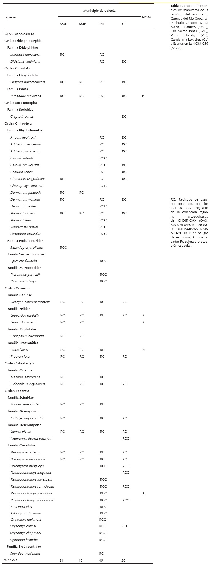 Key words: Candelaria Loxicha, Mammalia, Pluma Hidalgo, Pochutla District, San Mateo Piñas, Santa María Huatulco, Shade coffee.