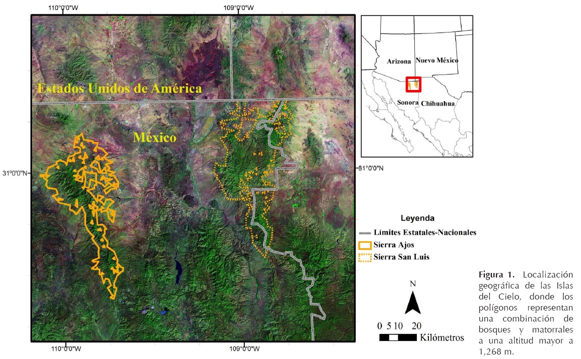Los sitios de estudio incluyeron dos Islas del Cielo, localizadas en las coordenadas extremas entre los 31.337° y 30.349° de latitud N y entre los -110.166° y -108.706° de longitud W. Sierra de Ajos que se encuentra dentro de la Reserva Forestal Nacional y Refugio de Fauna Silvestre Ajos Bavispe y la Sierra de San Luis (Fig. 1). En estas Sierras la vegetación dominante es el bosque de encino, donde las especies más comunes incluyen Quercus emoryi, Q. oblongifolia, Q. arizonica, Juniperus monosperma y J. deppeana (CONABIO 2009a, b). En las partes más elevadas (1,200 a 2,240 msnm) se encuentran bosques de pino encino caracterizados por Pinus engelmanii, P. ponderosa y Arbutus arizonica (Brown 1994; CONANP 2001). En las partes bajas (800 msnm) se encuentra el chaparral, donde las especies dominantes son Dasylirion wheeleri, Nolina microcarpa, Yucca torreyi, Y. baccata, Y. rostrata, Acacia constricta y Arctostaphylos pungens (Brown 1994). La parte de pastizal la componen principalmente los géneros Aristida sp., Bouteloua sp., Digitaria sp., Muhlenbergia sp., Setaria sp. y Panicum sp. (Martínez-Yrízar et al. 2010).