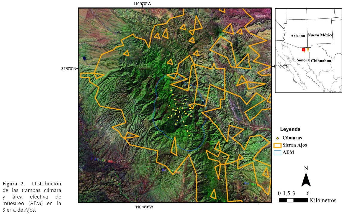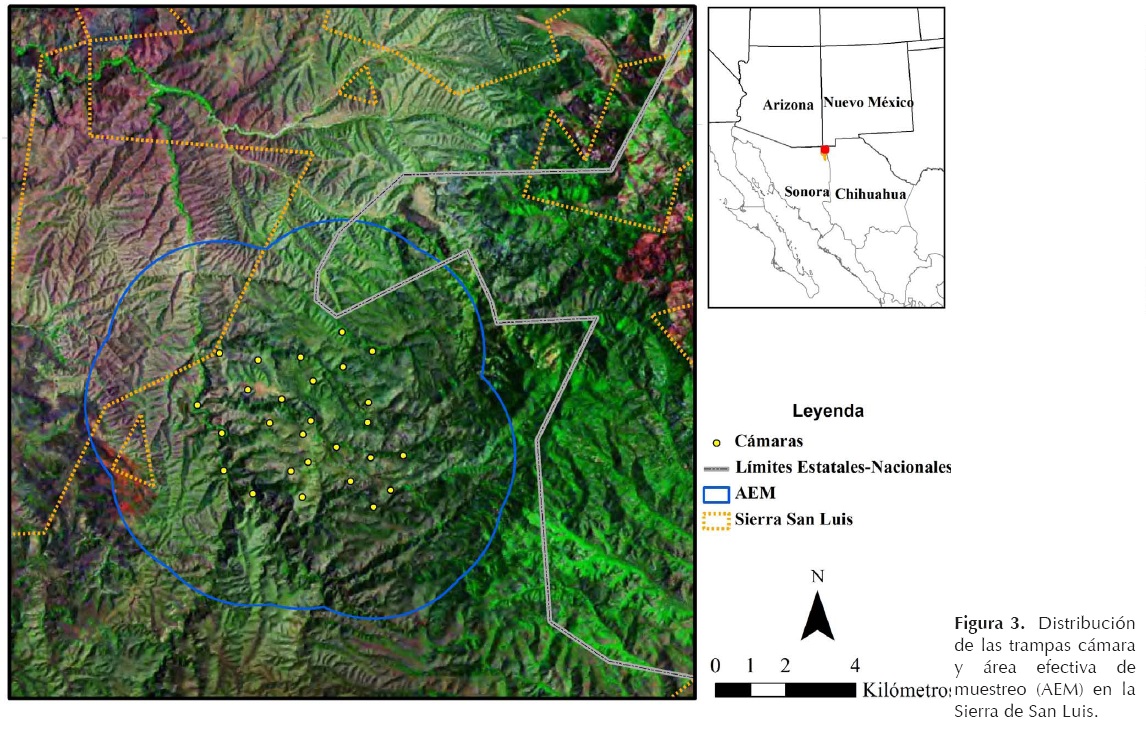Para estimar la densidad, primero calculamos el área efectiva de muestreo (AEM), generando un área de amortiguamiento alrededor de cada trampa cámara, tomado como base el ámbito hogareño registrado para la Sierra de San Luis (32.33 km2; López-González y Lara-Díaz 2010). Estas áreas, se disolvieron y fueron sumadas, representando así el AEM, la cual fue expresada en km2. Para Sierra de Ajos el AEM fue de 131.33 km2 y para Sierra de San Luis de 109.89 km2 (Fig. 2 y Fig. 3).