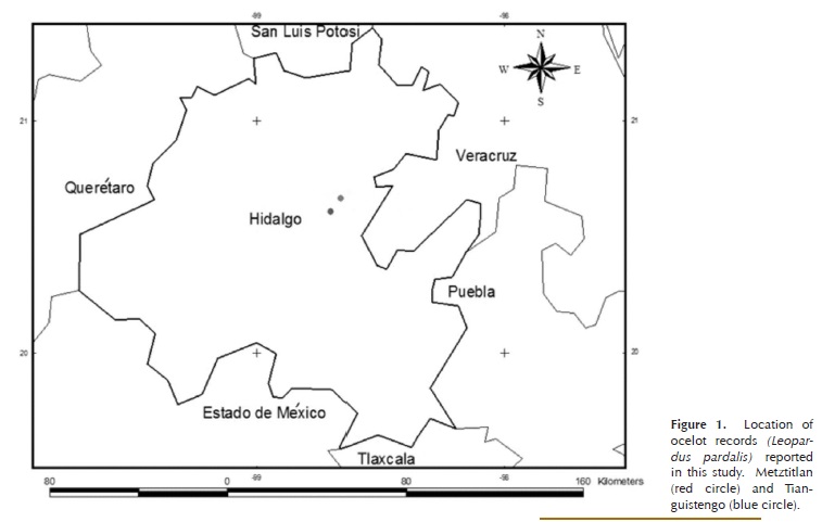 The presence of this cat in Hidalgo is to be expected, because it has been reported in the nearby States of Mexico, Puebla, Veracruz and San Luis Potosi. However no precise record for Hidalgo appears in the literature (Hall 1981; Murray and Gardner 1997; Mejenes et al. 2010), in scientific collections, or in online electronic databases (GBIF: Global Biodiversity Information Facility. MANIS: The Mammal Networked Information System or UNIBIO: Computer Unit for biodiversity).