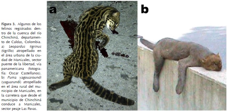 De las especies de mamíferos registradas para la cuenca del río Chinchiná (Tabla 3), cuatro se encuentran en categoría Vulnerable (VU) según la UICN: Aotus lemurinus (mico de noche andino; Morales-Jiménez y de la Torre 2008), Dinomys branickii (guagua loba; Tirira et al. 2008a), Leopardus tigrinus (tigrillo; De Oliveira et al. 2008) y Mazama rufina (venado de páramo; Lizcano y Alvarez 2008); cinco especies se encuentran en categoría Datos Deficientes (DD): Cabassous centralis (armadillo cola de trapo; Superina y Abba 2010), Histiotus humboldti (murciélago marrón orejón; Velazco y Aguirre 2008), Nasuella olivacea (cuchucho andino; Reid y Helgen 2008), Sciurus pucheranii (ardilla andina; Amori et al. 2008), Thomasomys bombycinus (ratón montañero; Delgado et al. 2008); y cuatro especies se encuentran en categoría Casi Amenazadas (NT): Cuniculus taczanowskii (paca de montaña; Tirira et al. 2008b), Sturnira aratathomasi (murciélago de hombros amarillos; Pacheco et al. 2008), Sturnira oporaphilum (murciélago de hombros amarillos de oriente; Barquez y Diaz 2008) y Vampyrum spectrum (falso vampiro; Aguirre et al. 2008). A pesar de la alta deforestación y fragmentación de los diferentes tipos de selvas andinas que cubren la cuenca del río Chinchiná, esta juega un importante papel, ya que sirve de hábitat para varias especies de mamíferos amenazados de extinción.