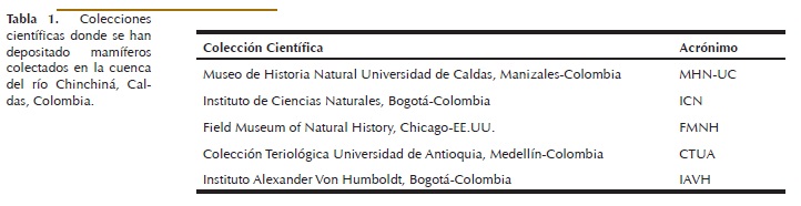 Metodología. La obtención de la información se basó en datos de fotografías in situ y especímenes o parte de estos, depositados en el Museo de Historia Natural de la Universidad de Caldas (MHN-UC) y revisión de literatura (e.g. Sanabria 1998; Sánchez 2000; Castaño et al. 2003; Sánchez y Alvear 2003; Gómez 2004; Sánchez et al. 2004; Castaño y Cardona 2005; Roncancio y Estévez 2007; Corrales y López 2009; Castaño et al. 2010; Corpocaldas y Castaño 2010; Rodríguez-Posada 2010; SCO 2012). Los datos sobre las categorías de riesgo en las que se encuentran las especies están basados en la lista roja de especies amenazadas de la UICN (Unión Internacional para la Conservación de la Naturaleza). Los mamíferos colectados dentro de la cuenca del río Chinchiná han sido depositados en diferentes colecciones científicas especificadas en la Tabla 1.