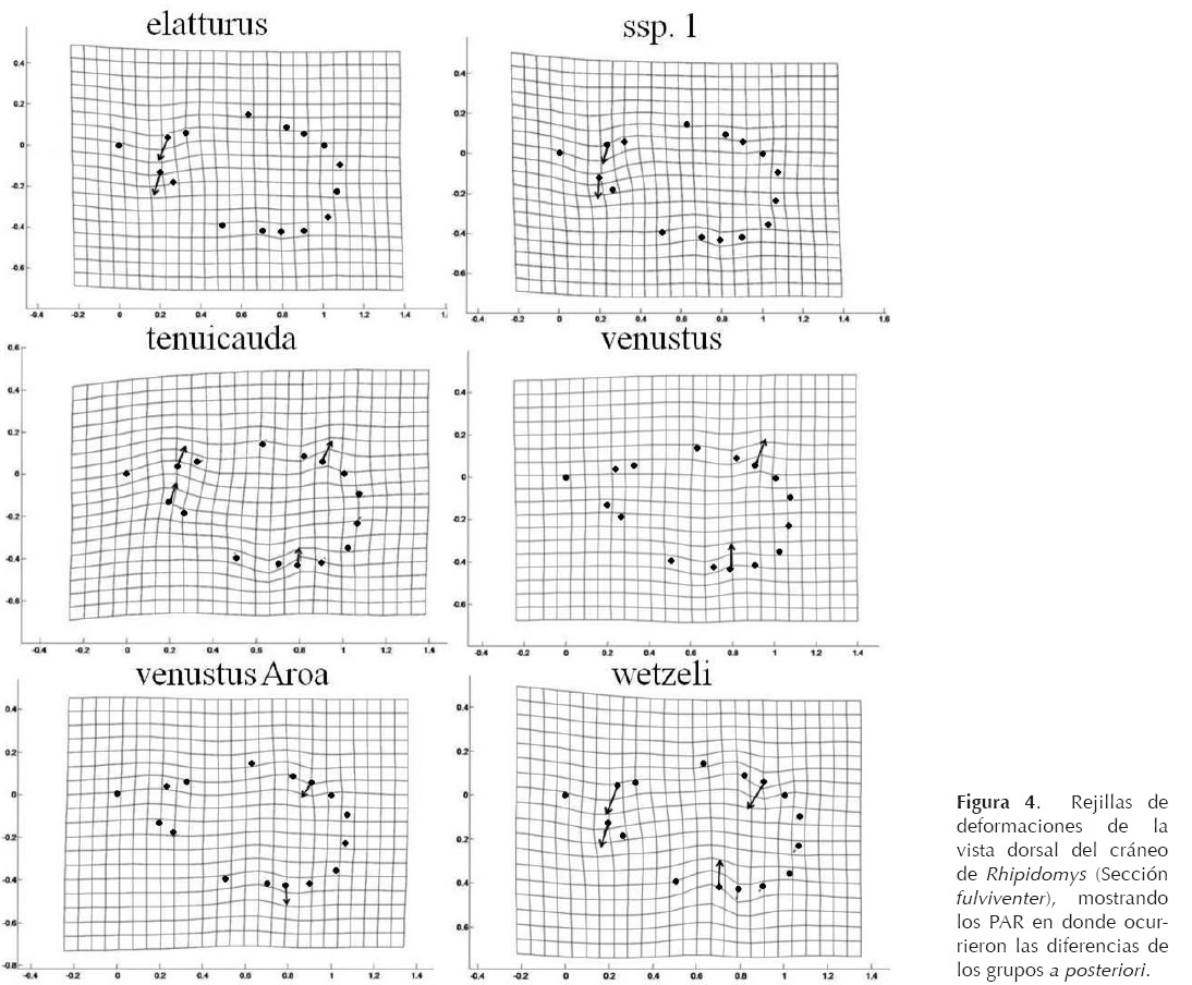 A pesar de contar con una baja representatividad de especímenes analizados, se pueden interpretar los resultados de la siguiente manera: el lado dorsal del cráneo, representa el área en donde se manifiestan los mayores cambios, resaltado en la región del rostro y cefálica (raíz de los arcos cigomáticos, parietales, interparietales y occipital). Rhipidomys venustus Aroa (Sierra de Aroa) y R. wetzeli, son los taxa que poseen los cráneos más diferenciados en cuanto a la forma y tamaño (ver Figs. 3A, 4). Por su parte, R. venustus (Cordillera de Mérida, Cordillera Central, Sistema de Colinas Lara-Falcón) y R. venustus Aroa, tienen diferencias entre si (ver Tabla 1, Figs. 3A, 4), lo que posiblemente significaría que la población de la Sierra de Aroa puede ser un taxon no nombrado, incluido aquí en R. venustus.