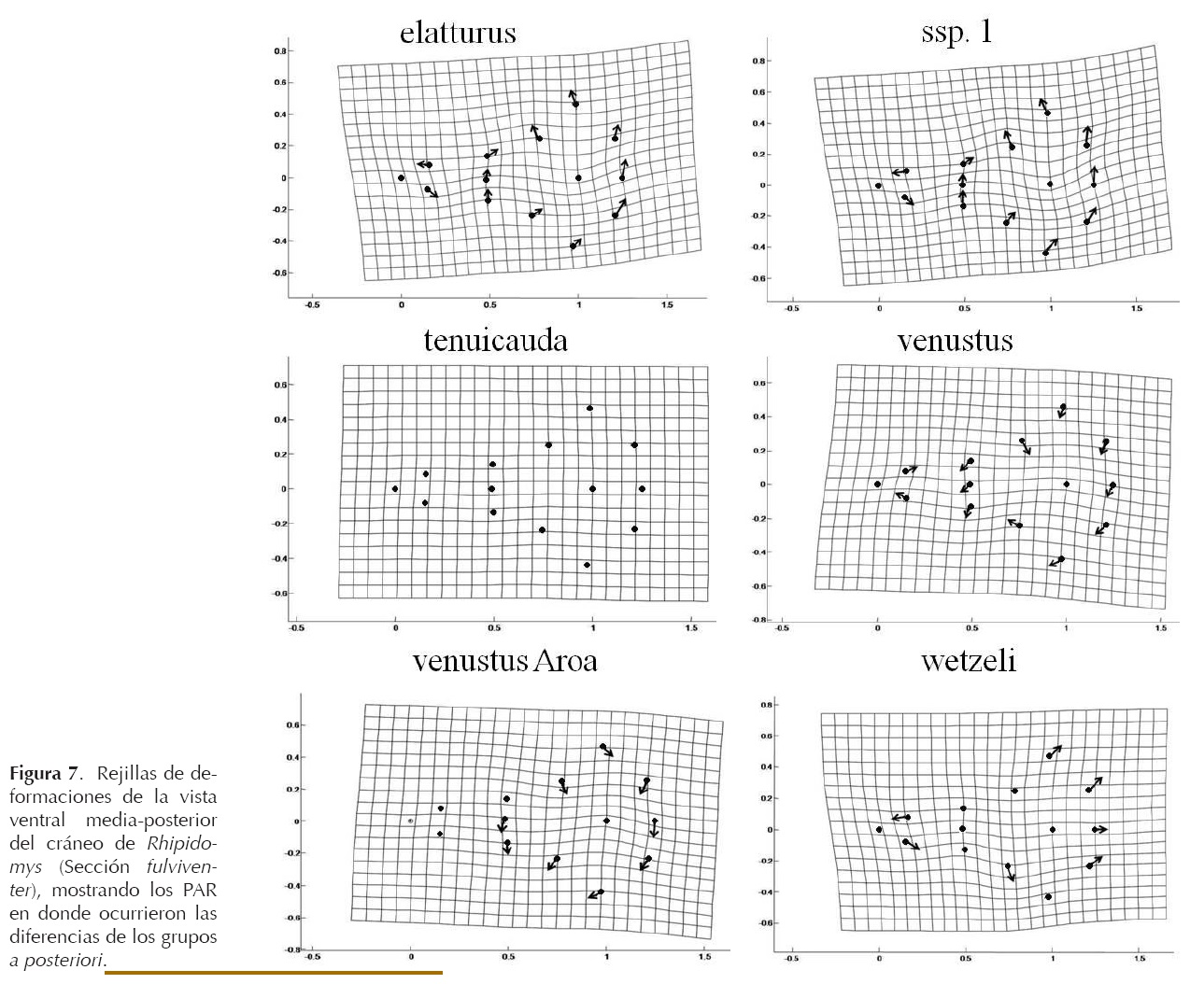 Con respecto a la región media-posterior, el TC de R. f. elatturus (19.82 mm ± 0.75) y R. wetzeli (18.25 mm ± 0.40), difirieron significativamente (P < 0.01) de R. f. tenuicauda (22.54 mm ± 0.045), R. f. ssp. 1 (23.44 mm ± 1.52), R. venustus (22.60 mm ± 0.51) y R. venustus Aroa (22.35 mm ± 0.48). Los valores de cada eje discriminante fueron los siguientes; Eje 1 Wilks lambda (Λ1) = 0.0001, χ2 = 206.3199, g.l. = 120, y P < 0.0001. Eje 2 Wilks lambda (Λ1) = 0.0015, χ2 = 136.0232, g.l. = 92, y P < 0.001. Las muestras reclasificadas al 100% fueron: R. f. elatturus (6/6); R. f. ssp. 1 (3/3); R. venustus (9/9); R. venustus Aroa (8/8) y R. wetzeli (4/4). Por su parte, R. f. tenuicauda obtuvo el porcentaje menor (85%; 6/7). El diagrama factorial del AVC muestra la separación de cuatro taxa (R. venustus Aroa, R. wetzeli, R. f. elatturus y R. f. ssp. 1), mientras que R. venustus y R. f. tenuicauda son las más parecidas en la región ventral media-posterior (Fig. 3D). Las placas de deformación (TPS), mostraron que las mayores deformaciones para todos los taxa (excepto R. f. tenuicauda), ocurrieron hacía la región basioccipital (desde el PAR 3 hasta el 13; Fig. 7). La Tabla 1, mostró que una medida en el foramen magnum, en la región ventral media-posterior, claramente evidenció diferencias de R. venustus y R. venustus Aroa con respecto a los demás.
