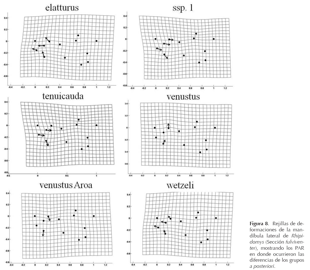 Los resultados de la prueba de reclasificación de cada eje discriminante del AVC fueron los siguientes: Eje 1 Wilks lambda (Λ1) = 0.0006, χ2 = 161.9908, g.l. = 110, y P < 0.0009. Eje 2 Wilks lambda (Λ1) = 0.0064, χ2 = 111.0312, g.l. = 84, y P < 0.025. Las asignaciones del 100% de reclasificación correspondieron para R. f. ssp. 1 (3/3); R. venustus Aroa (8/8) y R. wetzeli (4/4). Los porcentajes menores fueron para R. f.tenuicauda (85%; 6/7), R. f. elatturus (83%; 5/6) y R. venustus (66%; 6/9). El diagrama factorial del AVC muestra una marcada separación para R. venustus Aroa y R. f. ssp. 1 (Fig. 3E). En cuanto al TPS, las mayores deformaciones fueron observadas en la región anterior de la mandíbula (PAR 2, 3, 12 y 13) para R. f. elatturus, R. wetzeli, R. f. ssp. 1 y R. f. tenuicauda, mientras que R. venustus Aroa y R. venustus los PAR 3 y 12 se desplazaron en sentido contrario (Fig. 8). La Tabla 1, evidenció que R. venustus y R. venustus Aroa fueron más grandes en cinco medidas de la mandíbula: longitud de la mandíbula, altura de la hendidura sigmoidea, del proceso condilar y coronoide y ancho del dentario. Por su parte, R. wetzeli fue menor en todas las medidas consideradas para la mandíbula en este estudio.