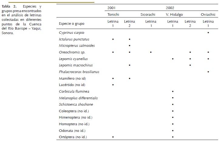 Análisis de letrinas. Del total de excretas analizadas, 36 corresponden a seis letrinas en diferentes localidades cada una, mostrando las preferencias alimentarias de la nutria neotropical en la cuenca del Bavispe-Yaqui. Estas letrinas fueron encontradas en las localidades de Tonichi en 2001 (dos letrinas), y Sicorachi en 2002 (una letrina) Villa Hidalgo en 2002 (dos letrinas) y Oviachic en 2002 (una letrina; Fig. 1).