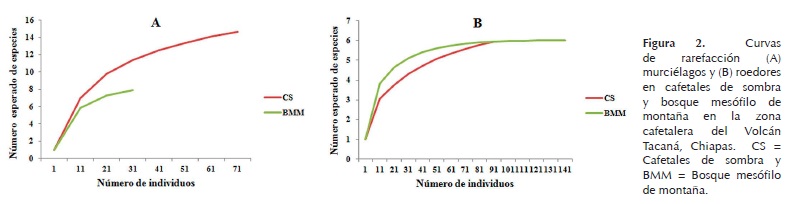 En caso de los roedores, la riqueza de especies fue similar en ambos hábitats (6 spp), pero con una abundancia mayor en bosque mesófilo (145 individuos) que en cafetal (97 individuos). El índice de diversidad arrojó un valor numéricamente más alto en bosque mesófilo (H' = 0,569) que en cafetal (H' = 0,474), sin embargo no hubo diferencia significativa (t = 0.59; g. l. = 17; P > 0.05). En la curva de rarefacción se observa una tendencia inicial de mayor riqueza en bosque mesófilo, sin embargo hacia mayor valor de abundancia las curvas se acercan hasta encontrarse (Fig. 2b). Los valores del estimador Chao1 en cafetal (VP = 6.25, ICmin = 6.01 y ICmax = 10.71) y bosque mesófilo (VP = 6, ICmin = 6 y ICmax = 6.49), muestran una tendencia similar entre sus valores, los cuales se incluyen dentro del mismo intervalo de confianza. Si bien no se alcanzo la asíntota en la curva de acumulación de roedores, se registró el 77.6% en cafetal y 88.6% en bosque mesófilo del total de especies estimadas por el modelo (Smax = 7.7264 en cafetal y Smax = 6.769 en bosque mesófilo), en donde se esperaría adicionar dos y una especie más en cada hábitat respectivamente para alcanzar la asíntota (Fig. 4b).