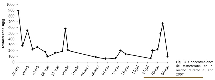 El estradiol y la progesterona, cuantificados a lo largo del año, mostraron una serie de picos correspondientes a los períodos en que se presentó la conducta sexual, tanto desde enero hasta a abril como en agosto (Fig. 2), en el macho durante ese mismo año también se observa un incremento de la testosterona en el periodo reproductivo y en el mes de agosto (Fig. 3).