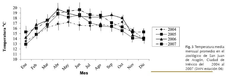 Factores ambientales. Durante los años en que la hembra permaneció en el Zoológico de Aragón en la Ciudad de México, no se presentaron variaciones relevantes en los ciclos luz-oscuridad (Fig. 4), y tampoco en los ciclos de temperatura de la ciudad de México (Fig. 5).