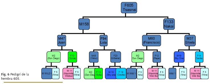 Análisis del pedigrí. Respecto a la hembra, a lo largo del pedigrí general y en la revisión del coeficiente de endogamia y grado de parentesco en el studbook (Siminski 2012). Se encontró que al igual que el resto de la población de lobo mexicano, sus ancestros están emparentados; aún así, la hembra no esta considerada como ejemplar de alta consanguineidad. Al contrario, se la ha considerado como un buen candidato para la reproducción, ya que su genoma no está sobrerrepresentado dentro de la población cautiva de lobo mexicano (Speevak 2008; Fig. 6).
