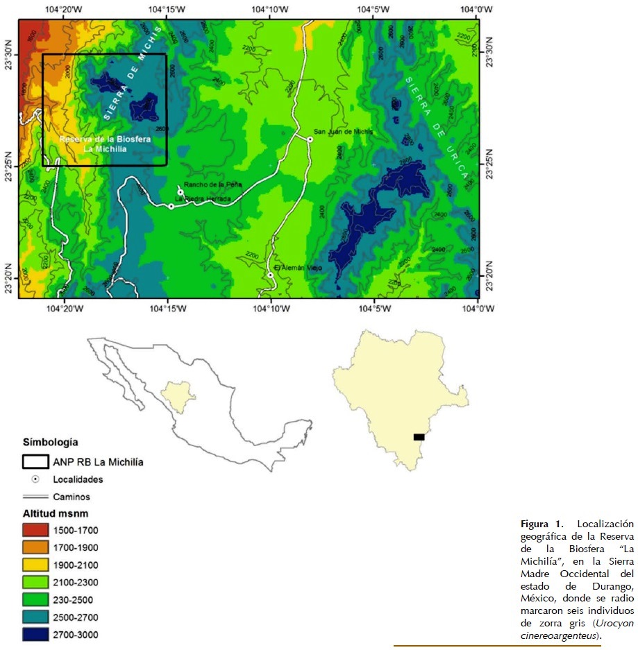 Área de estudio. El estudio se realizó en la Reserva de la Biosfera "La Michilía", en el estado de Durango, entre los paralelos 23.4167° y 23.5000° de latitud Norte y los meridianos -104.2500° y -104.3500° de longitud Oeste, sobre la Sierra de Michis, municipio de Súchil, Durango. La reserva cuenta con una superficie de 42,000 Ha de terreno heterogéneo, con abruptos cañones y depresiones profundas que dan lugar a pequeños valles y mesetas. Tiene una variación de la altitud de los 1,724 msnm hasta los 2,950 msnm. Fisiográficamente, el área de la reserva quedó delimitada por dos cordones montañosos de la zona de transición entre la Sierra Madre Occidental y la altiplanicie del Norte de México. Estas dos cadenas montañosas son la Sierra de Úrica, que marca los límites entre los Estados de Durango y Zacatecas, caracterizada por superficies suaves con pendientes poco pronunciadas; mientras que la otra sierra es la de Michis, cuyo relieve presenta depresiones profundas y pendientes pronunciadas y es en ésta donde se encuentra la zona núcleo de la reserva (Halffter 1978; Fig. 1).