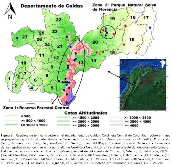 Results and discussion: We identified 33 locations with records of wild felids, which belong to six species: Leopardus pardalis (Ocelote), L. wiedii (Margay), L. tigrinus (Oncilla), Puma yagouaroundi (Jaguarundi), P. concolor (Puma), and Panthera onca (Jaguar). In this work, we identified two areas of the department where most of the records were made. The first area is located in the south-central portion of Caldas and it includes the majority of the records of L. tigrinus and P. concolor. The second area is located in the northeastern portion of the department and it is associated with all of the records of L. wiedii and most of the records of L. pardalis and P. yagouaroundi. The main threats to the survival of wild cats in Caldas are: habitat loss, fragmentation, hunting, as well as road mortality. Since 1999, there are no records of Panthera onca for Caldas, and more research is required to confirm whether this species still inhabits the department.