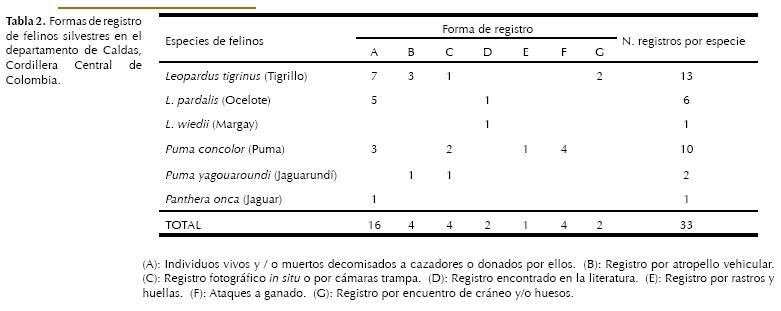 Materials and methods: To carry out the review of the composition, distribution and conservation status of the wild cats of Caldas department, were taken into account: A) Specimens, or part of these, deposited within biological collections. B) Records in scientific literature. C) Photographic records. D) Records of live individuals coming from the Caldas department who entered to the Center of Care, Assessment and Rehabilitation of Wildlife of the Regional Autonomous Corporation of Caldas (Corpocaldas). E) Records coming from attacks by wild cats on sheep, cattle and horses within the department.
