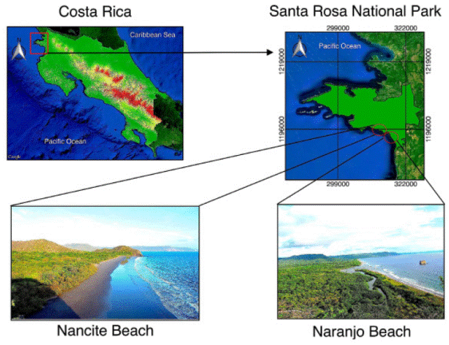The Naranjo and Nancite beaches (Figure 1) are located in the southwestern part of SRNP and have a length of 5,640 m and 1,050 m respectively. These beaches are separated from one another by a rocky mountain (~500 m). Naranjo beach is fully opened to local and international tourists. On the contrary, Nancite has been protected from intrusive human activities, including tourism and supports an intact wild ecosystem. Nancite beach is well known for the olive ridley sea turtle "arribada" phenomenon (Cornelius 1986; Fonseca et al. 2009). This phenomenon consists of the massive synchronous nesting of hundreds or thousands of olive ridleys over a few consecutive nights (Cornelius 1986; Bernardo and Plotkin. 2007; Fonseca et al. 2009). This event also occurs at beaches in Mexico (La Escobilla and El Morro Ayuta), Costa Rica (Ostional), and India (Gahirmatha and Rushikulya), with minor arribada beaches also present in Nicaragua (La Flor and Chacocente) and in Panama (Isla Cañas) (Bernardo and Plotkin 2007).