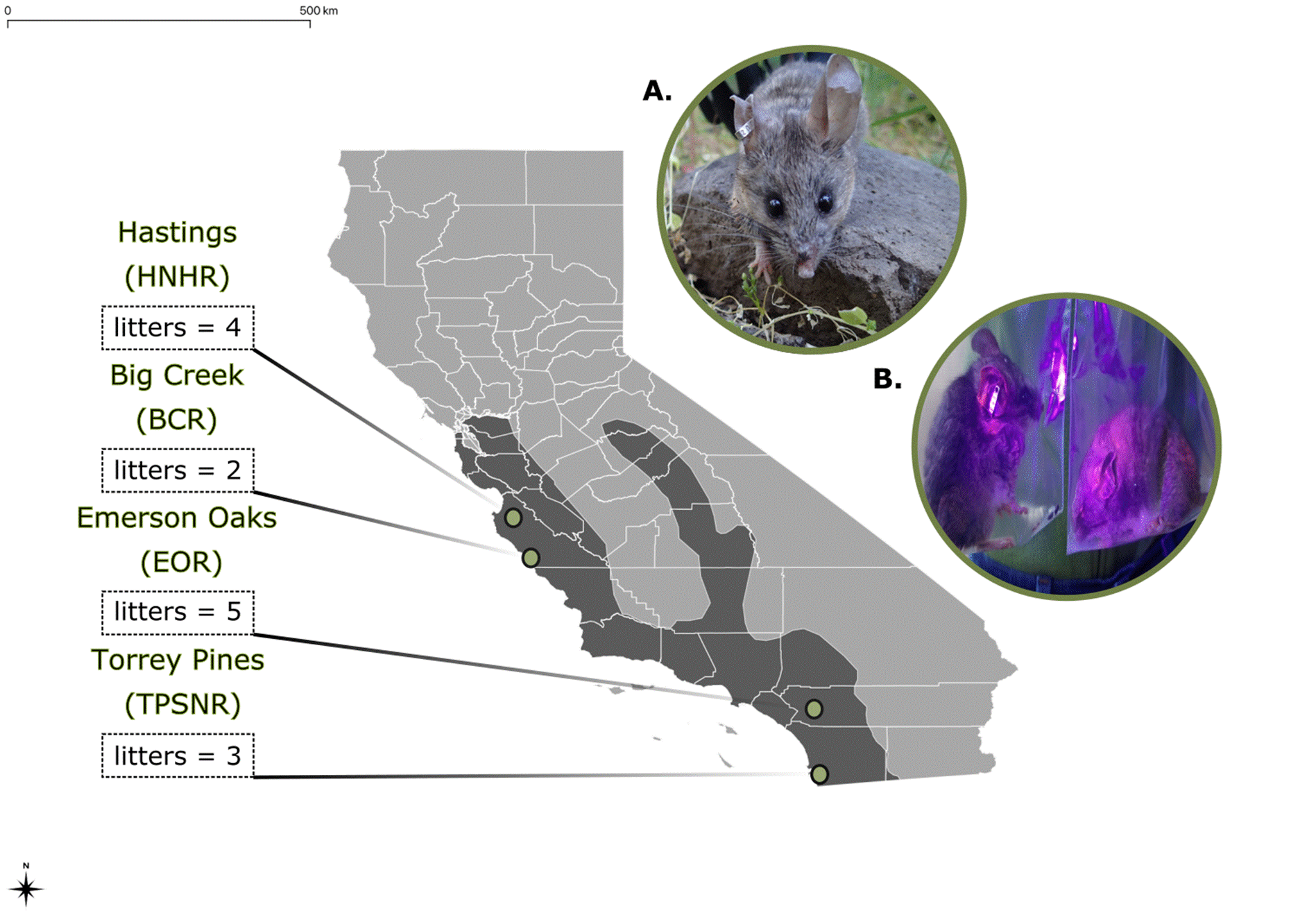 Field sites, trapping, and marking of animals. Mice were captured at 4 localities - 2 in the northern and two in the southern portion of the range of P. californicus (Figure 1). The northern sites sampled were at the Hastings Natural History Reservation, Carmel Valley, California and the Landels-Hill Big Creek Reserve, Big Sur, California. The two southern sites were located at the Emerson Oaks Reserve, Temecula, California and the Torrey Pines State Natural Reserve, La Jolla, California. These are the same locations sampled by Melendez-Rosa et al. (2020). As described by these authors, the two northern sites are characterized by greater annual rainfall; for both northern and southern localities, the more coastal site receives greater rainfall than the more inland site. Collectively, these sampling localities span much of the range of habitats and environmental conditions in which P. californicus is known to occur (Meléndez-Rosa et al. 2020).