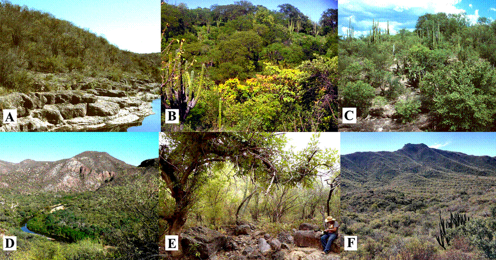 Figure 1 Tropical ocelot habitats in Sonora. A. Tropical deciduous forest along the Río Cuchujaqui east of Álamos. January 1984 (Photo T. R. Van Devender). B. Tropical deciduous forest near Álamos. Summer 1991. Hecho cacti (Pachycereus pecten-aboriginum) are prominent (Photo M. A. Dimmitt). C. Foothills thornscrub near Curea. September 1998. Organ pipe cacti/pitahaya (Stenocereus thurberi) are common (Photo T. R. Van Devender). D. Foothills thornscrub above the Río Bavispe on Rancho Pueblo Viejo east of Divisaderos. November 2016 (Photo T. R. Van Devender). E. J. M. Galaz-Galaz checking wildlife camera in foothills thornscrub on Rancho Pueblo Viejo. November 2016 (Photo A. L. Reina-Guerrero). F. Foothills thornscrub at Puerta del Sol, Sierra Pajarito east of Ures. November 2018. Visible on lower right are an organ pipe cactus and a fish poison tree/palo blanco (Piscidia mollis gray leaves) (Photo N. L. Villanueva-Gutiérrez).