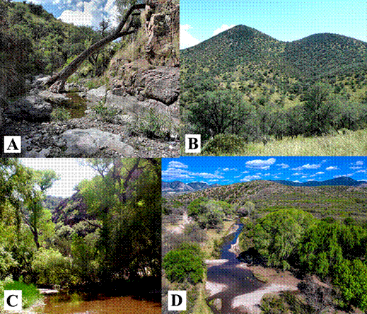 Figure 2 Temperate ocelot habitats in Sonora. A. Rocky stream canyon in oak woodland. Arroyo Las Palomas, Rancho El Aribabi, Sierra Azul, east-northeast of Ímuris. October 2015 (Photo J. C. Rorabaugh). B. Oak woodland dominated by Arizona white and Mexican blue oaks (Quercus arizonica, Q. oblongifolia). Sierra Alacrán southeast of Cananea. September 2018 (Photo A. L. Reina-Guerrero). C. Cottonwood-willow (Populus fremontii-Salix spp.) riparian deciduous forest, desert grassland on slopes. Cajón Bonito, Rancho los Ojos Calientes east of Agua Prieta. August 2007 (Photo T. R. Van Devender). D. Cottonwood-willow riparian gallery forest along Río Santa Cruz in desert grassland. Aerial view to the north of Paseo del Cajón northeast of San Lázaro. April 2019. Only 18 km south of the border, this is a likely corridor for ocelots to the Huachuca Mountains in Arizona (Photo L. Gutiérrez, NortePhoto, Inc).