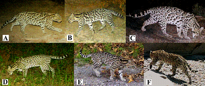 Ocelots are commonly photographed in foothills thornscrub habitats at localities in the lower Río Bavispe Valley (Figure 1 A, B and D). Ocelots are also photographed with regularity as far north as Rancho El Aribabi in the Sierra Azul in oak woodland (Figure 2 A and B; Figure 4 E and F) and along the Río Cocóspera (30.856° N) in riparian habitats. Additionally, ocelots shift from tropical lowland habitats into upland desert grassland, oak woodland, and pine-oak forest north of the Neotropics. Ocelots have been recorded from 53 to 2,151 m (average 840 m) in Sonora but are not expected to be found near sea level in the southern coastal areas. Ocelots probably use riparian habitats to disperse between areas and vegetation types.