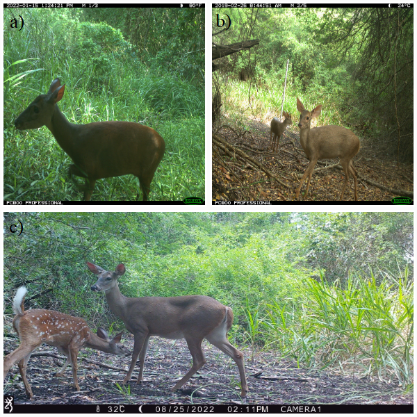 Figure 1 a) Central American red brocket deer (Mazama temama). b) Yucatan brown brocket deer (Odocoileus pandora). c) White tailed-deer (O. virginianus).