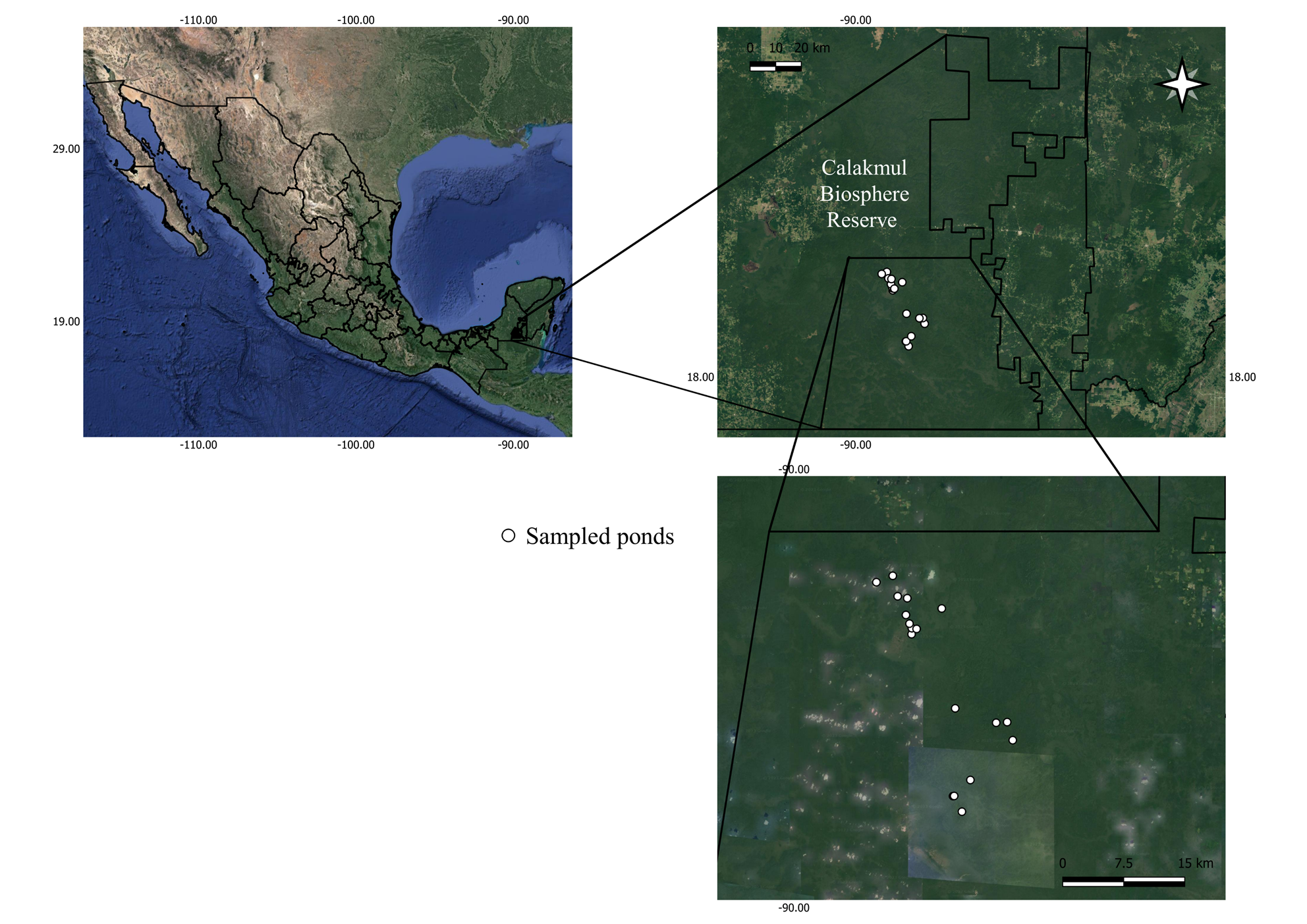 Study area. Calakmul Biosphere Reserve (CBR) is a protected area decreed in 1989, with an extension of 7,231 km2, located in the municipality of Calakmul, southeast Campeche, 19° 15’ 17” N, -90° 10’ 89” W (Carabias-Lilloet al.1999). The reserve presents a tropical sub-humid climate, with a rainy season in summer (Jun to November), having an annual mean temperature of 24.6 °C, and an annual mean precipitation of 1,076 mm (Martínez and Galindo-Leal 2002). The reserve's hydrography is determined by the amount of rainfall, which is capable of flooding lowlands and forming temporary and permanent ponds and surface stream beds Carabias-Lillo et al. 1999). The ponds are vital components of the landscape for wildlife, being one of the few water sources of the region in the dry season (Reyna-Hurtado et al. 2010; Pérez-Cortez et al. 2012). The main vegetation types in Calakmul are high evergreen forest, medium sub evergreen forest, low evergreen and deciduous forest, savanna and hydrophytes (Pennington and Sarhukan 1998; Carabias-Lillo et al. 1999; Martínez and Galindo-Leal 2002).