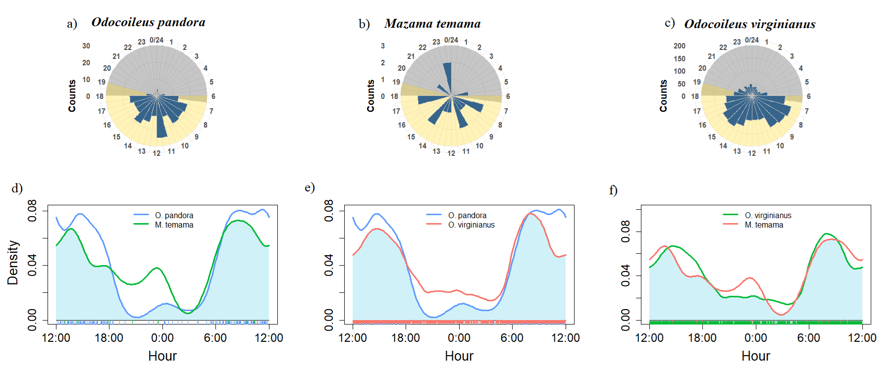 Figure 3 a-c) Number of records per hour for Odocoileus pandora, Mazama temama and O. virginianus. d-f) Kernel activity overlaps between each pair of species in Calakmul Biosphere Reserve, México.