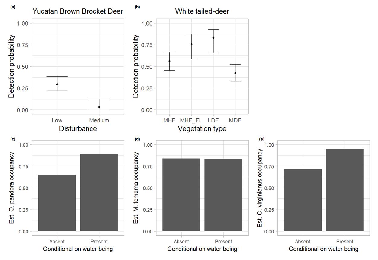 Figure 4 a) Relation between O. pandora Detection and level of disturbance. b) Relation between O. virginianus detection and vegetation type. c-e) Interac tion between the presence or absence of water and the occupancy of the three deer species, in ponds of Calakmul Biosphere Reserve, México. MHF = Mid Humid Forest, MHF_FL = Mid Humid Forest and Flooded Lowland, LDF = Low Dry Forest, MDF = Mid Dry Forest.