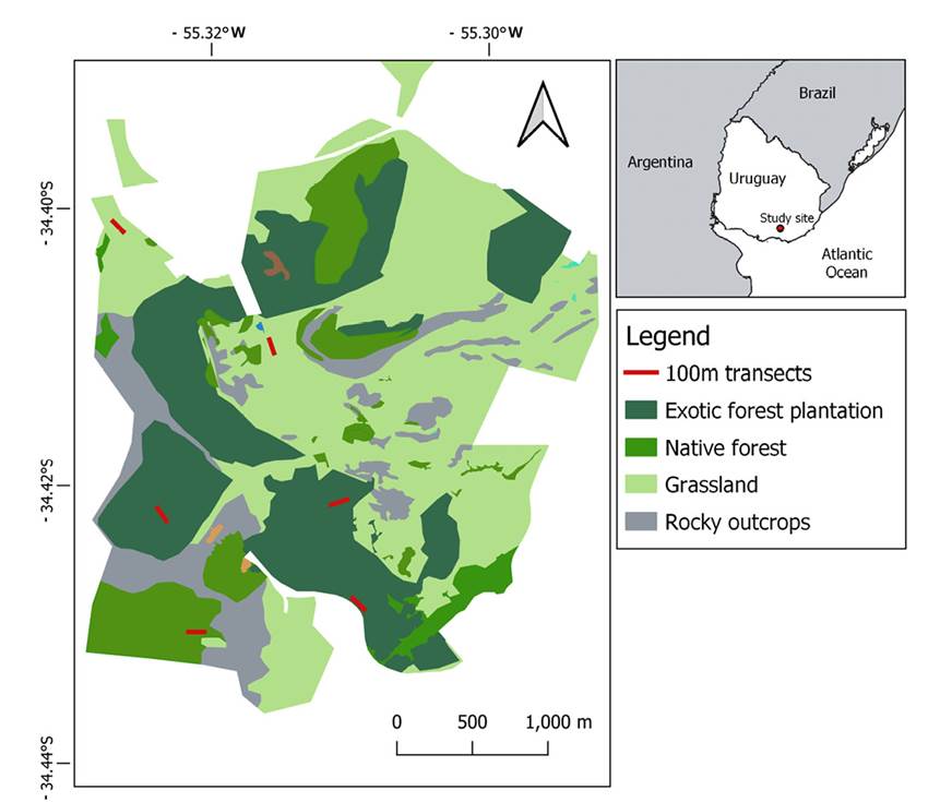 Figure 1 Habitat mosaics inside the 'Reserva Natural Salus' (RNS)'s. Red lines represent the location of each survey transect where gray brocket deer samples were collected. Right: Location of the RNS (red point) in Uruguay.