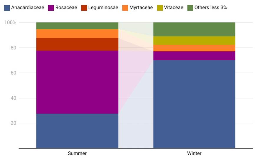 Diet Analyses. Forty-eight feces were collected in summer and 51 in winter, however more than half did not provided good enough DNA quality required for PCR. From the DNA extraction of these samples, it was possible to confirm the identity of the deer species in nine and five samples collected in summer and winter respectively. For the summer sampling, three PCR products of the TrnL (UAA) region were obtained and pooled, generating 43,906 reads. After filtering for quality and size, 28,229 reads were assigned to 21 OTUs. For winter sampling (June), three samples were pooled, which generated 52,136 reads, reducing to 33,588 after filtering to obtain 16 OTUs. With the two pooled samples, we obtained a total of 25 OTUs belonging to 17 families. At the family level, five families were represented in one of the two samples by more than 3 % of the reads. The dominant families were Anacardiaceae and Rosaceae, representing 77 % of the reads obtained in each sampling season (Figure 2).