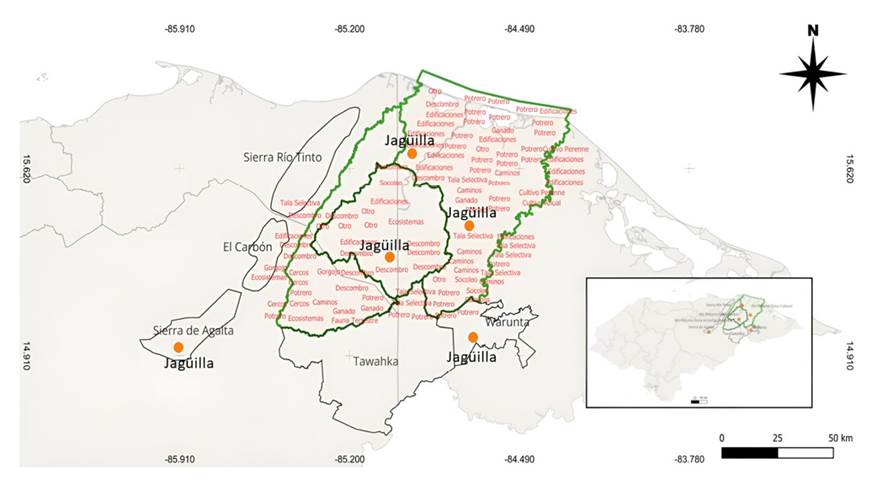 Figure 1 RHBRP, showing the three zones (ZN, ZC, ZA) with anthropogenic activities that are putting pressure on the stability of jagüilla populations. These activities include hunting, deforestation for cattle ranching, selective logging of mahogany, road construction, and infrastructure for ranches, among others. Similarly, the protected areas of Sierra de Agalta NP and the region in the Warunta Mountains have recently recorded jagüillas (Ssource: WCS 2023).