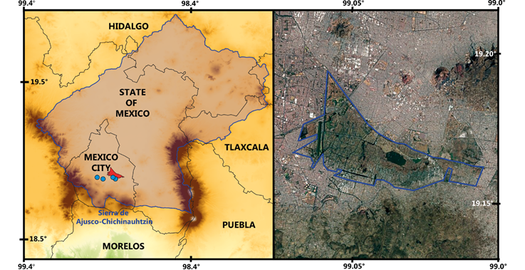 Figure 1 Region associated with the distribution of Oryzomys fulgens. Left: Limits of the Basin of Mexico with the Xochimilco region (in red). Right: Lake Xochimilco within the urban area of Mexico City. The blue dots show the localities of O. fulgens: 1) Probably the type locality “Tepepan” (Boucard 1894), 2) type locality of O. crinitus of “Tlalpan” (Merriam 1901), 3) “Xochimilco” (González-Romero 1980), and 4) 2 km N, 3.9 km W of San Gregorio Atlapulco, 2,240 m (this study).