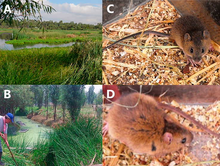 Figure 2 Photographs of the Xochimilco region and specimens of Oryzomys fulgens. A) General view of the Xochimico wetland. B) Precise site where we collected the two specimens of O. fulgens. C) A female specimen (UAMI 17346) and D) A second female specimen (released at the collection site) of O. fulgens.