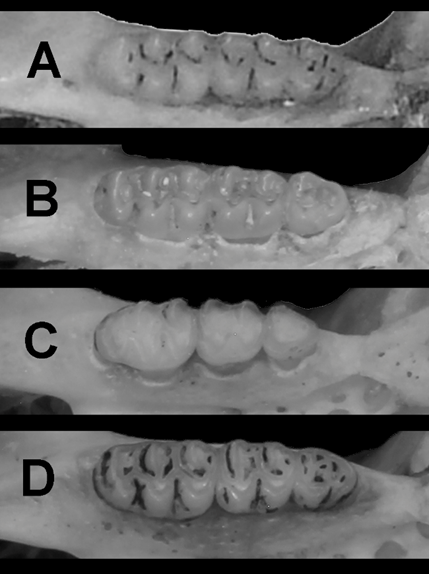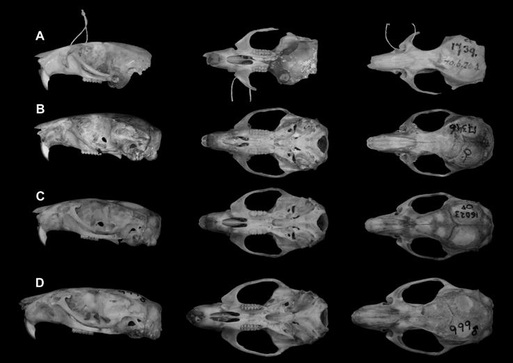 Figure 3 Lateral, ventral and dorsal view of some of the specimens examined. A) Holotype, a young adult male, of Oryzomys fulgens (BMNH 70.6.20.3). B) Young adult female O. fulgens collected in Xochimilco at 2 km N, 3.9 km W San Gregorio Atlapulco, 2240 m (UAMI 17346). C) Old adult male O. mexicanus from El Salto, 4 km WSW Minatitlán, Colima (UAMI 16023). D) Young adult male O. albiventer from 3 km W Venustiano Carranza, Michoacán (UAMI 999).